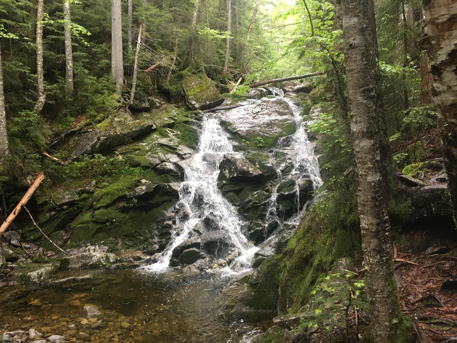 Yeah!  I had last year’s day 2 on my mind all day.  If you don’t had was the day of my fall which ended my hike.   I had plenty of opportunities for a repeat today but it was a good despite the weather.    It rained all day with two large thunderstorms.   The trail was a stream and because it has rained so much lately many of the walk boards are under water.   I had to ford several high streams.   Even without the weather this section of trail is tough.  At times, the trail required all fours to climb the huge boulders going up to south kinsman peak.   Today was one of the most physical hikes I’ve ever done.   During the second thunderstorm I stopped in to see my first hut.   These are like “The Hike Inn” in Georgia but there are many of them in the White Mtn.  I saw a total of 5 people today so the trail was definitely not crowded.